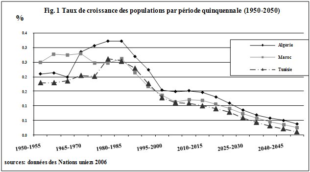 Le taux de croissance dans la région a été divisé par deux dans les trente dernières années ; il est aujourd’hui de 15‰ en Algérie et de 11‰ au Maroc et en Tunisie. La baisse de la natalité et de la fécondité sont à l’origine de ce net recul de la croissance démographique. Plus de 7 enfants par femme au milieu des années 1970, l’ISF est aujourd’hui inférieur à 3 enfants par femme. La diminution du nombre moyen de naissances par femme annonce la fin de la transition démographique dans la région (Fig.3).