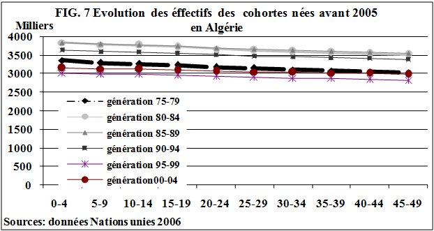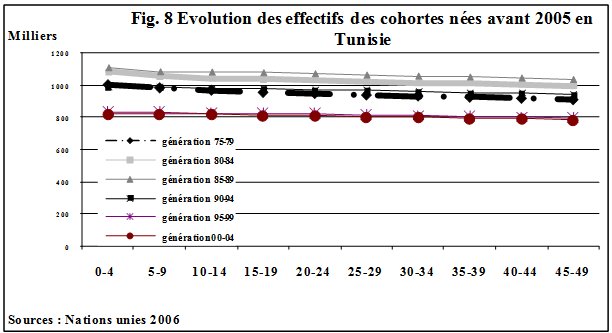 Les générations qui arrivent sur le marché du travail et sur le marché matrimonial auront les effectifs les plus importants de l’histoire démographique de ces pays. Si on observe l’évolution des effectifs des différentes cohortes composées d’individus nés avant 2005, la génération (1975-79) a des effectifs moindres que les générations suivantes dont les individus sont nés au moment où s’amorce la baisse de la fécondité ; il faut attendre les générations dont les individus qui les composent sont nés après 1995 pour que les effectifs deviennent moins importants (Fig. 7 & 8). Les générations nées au cours des années 1980 et au début des années 1990 auront des effectifs beaucoup plus importants que leurs prédécesseurs et que les générations suivantes. Ils seront par conséquent plus nombreux à se présenter sur le marché du travail.