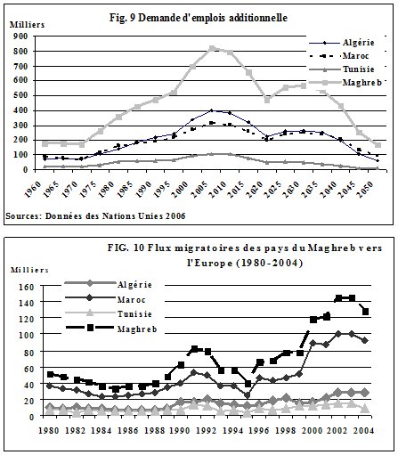 La migration est naturellement en dernier ressort régulée par le marché du travail. Entre 2000 et 2010, la croissance de cette tranche de la population mettra à rude épreuve le marché du travail local. En 2000, l’emploi global, dans les trois pays se situait à près de 15 millions, au rythme de la création d’emploi de la dernière décennie (400 000 emplois par an pour les trois pays) il sera en 2010 de l’ordre de 19 millions, alors que la population âgée de 20-40 ans sera de l’ordre de 28,5 millions. Dans le cas optimiste, où la création d’emploi suivra le rythme de ces 5 dernières années (la croissance annuelle a été supérieure à 5% du PIB) l’emploi créé sera de l’ordre de 8 millions et l’emploi total offert de l’ordre de 23 millions. En considérant que 50% de la population féminine de cette tranche d’âge serait inactive, il y aurait près de 21,5 millions d’actifs âgés de 20 à 40 ans, Les emplois sont naturellement occupés par les personnes âgées de 18 à 65 ans, il faudrait donc ajouter, aux demandeurs d’emplois âgés de 20-40 ans, les demandeurs d’emploi âgés de 18-19 ans et 40-65 ans[1].