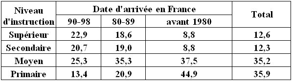 Cette faiblesse relative de la migration à partir de l’Algérie indique que des changements sont intervenus dans les profils migratoires, incontestablement en lien avec les politiques de restriction et de sélection de l’immigration adoptées par les pays européens ; ils sont cependant fondamentalement déterminés par les transformations constatées dans les pays de départ. La première phase migratoire touche à sa fin (population rurale, analphabète et sans qualification se dirigeant vers les emplois de l’industrie et de la construction en priorité) au profit d’une nouvelle vague migratoire qui a commencé à se dessiner au cours des années 1980 : population urbaine scolarisée à différents degrés, proportion de plus en plus grande de femmes prenant l’initiative de la migration et s’orientant vers les emplois tertiaires privilégiant les services aux entreprises et aux particuliers. Alors que pour le Maroc (Hamdouche & all, 2000) la première phase connaît un prolongement et coexiste probablement avec la seconde, notamment à la faveur de la migration vers l’Espagne et l’Italie. Les données statistiques relatives aux immigrants maghrébins enregistrés en France en tant que travailleurs permanents indiquent que pour les douze dernières années (1990-2002) 40 % des Algériens, 46 % des Marocains et 57 % des Tunisiens sont enregistrés comme des cadres, ingénieurs et techniciens. Les données du recensement français de 1999 montrent que les personnes nées en Algérie ont un niveau d’instruction plus élevé dans les générations arrivées dans la dernière décennie (Tableau 3)[2]. Il est évident que si de telles données existaient pour l’Espagne et l’Italie où la présence d’immigrés marocains est importante (plus de 300 000) et plus récente qu’en France, il y aurait, sans aucun doute, des proportions moindres de cadres et d’ingénieurs parmi les migrants.