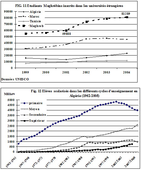 La baisse de la fécondité amorcée à la fin des années 1970 et le début des années 1980 (Fig. 3) n’a pas manqué de se concrétiser par un recul de la natalité de près de 50 ‰ dans les années 1970 à moins de 20‰ actuellement et par suite du nombre de naissances par année. En Algérie le nombre des naissances avait atteint 850 000 par an dans les années 1980 pour tomber à 600000 au début de l’an 2000. Il enregistre une légère augmentation au cours de ces dernières années. Il en découle une diminution des entrées dans le système scolaire et dans les effectifs de l’enseignement primaire (Fig. 12). Il se prolongera probablement dans le cycle moyen (scolarisation obligatoire dans le primaire et dans le moyen). L’Etat pourra ainsi diminuer ses efforts dans le budget d’équipement pour les orienter vers l’amélioration de la qualité de l’enseignement. Cependant, l’amélioration de la qualité de l’enseignement dans le primaire et le moyen ne peuvent que se traduire par l’augmentation des effectifs dans le secondaire et le supérieur. Les taux de réussite au baccalauréat qui stagnait en Algérie à moins de 30% ont dépassé les 50% au cours de ces dernières années ; les effectifs de l’enseignement supérieur en Algérie sont passés de 466 000 en 2000 à 762 000 en 2005. Ils sont estimés à plus d’un million pour l’année scolaire 2007-2008. La diminution des effectifs dans les premiers cycles ne peut que se traduire par un gonflement des effectifs dans les autres cycles d’enseignement où les coûts par élève sont beaucoup plus élevés. Pas d’amélioration sur le plan budgétaire mais un transfert sur les autres cycles, avec cependant une amélioration indéniable du capital humain. Les familles deux ou trois enfants investiront plus dans l’éducation par enfant pour un même budget consacré à l’éducation des enfants que s’ils en avaient 5 ou 6.