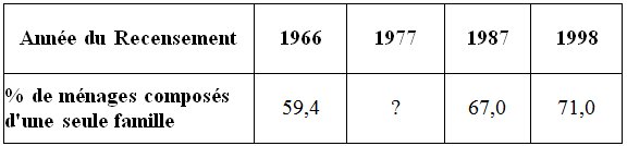 En Algérie, les recensements montrent une tendance générale à la réduction du nombre de familles par ménage (1,15 en 1998 contre 1,31 famille par ménage en 1966) et du nombre de familles par logement occupé bien que le taux d’occupation des logements reste particulièrement élevé. La proportion de familles couples avec enfants a, quant à elle, augmenté passant d’un peu moins de 60 % en 1954, à plus de 78 % en 1998 de l’ensemble des familles. Cette proportion plus grande de couples avec enfants enregistrée en 1998 est accompagnée d’un élargissement du processus de décohabitation des couples mariés ; 7 couples sur 10 ont un espace domestique non partagé avec des ascendants ou des collatéraux. Ces résultats suggèrent que la famille nucléaire se substitue à la famille élargie ou tout au moins devienne la forme dominante (Tableau 5).