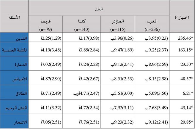 يمثل الجدول 1 المتوسطات والانحرافات المعيارية للمتغيرات السبعة للبحث بحسب البلدان الأربعة (فرنسا-كندا-الجزائر-المغرب) بالإضافة إلى نتائج اختبار التباين الإحصائي (أنوفا) واختبار المقارنات البعدية (اختبار جون توكي) لتحديد ما إذا كان هناك اختلاف مهم بين البلدان على مستوى هذه المتغيرات وهو الشيء الذي تمت ملاحظته بالفعل بوجود فوارق ملموسة بين المتغيرات بين الجزائر والمغرب (المغرب العربي) من جهة وبين كندا وفرنسا (أوروبا) من جهة أخرى، ويبقى الاستثناء الوحيد متعلقا بمتغيرة الطلاق حيث أشارت التباينات أن الوضع هو نفسه في كل من كندا والجزائر والمغرب، ولوحظ الاختلاف بين فرنسا من جهة وكل من البلدين المغاربيين من جهة أخرى.