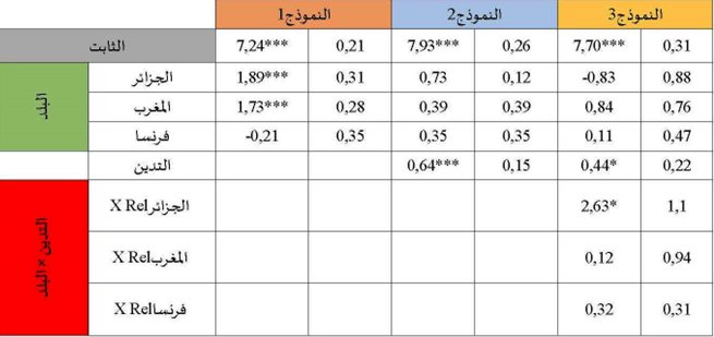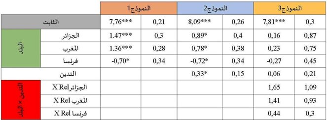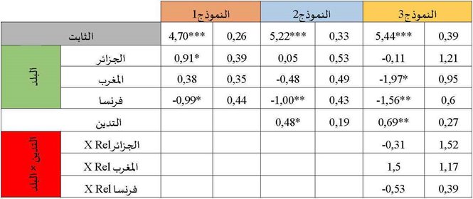 في ختام هذه الدراسة، تم الاحتفاظ بسؤال يتعلق بالدين وستة أسئلة حول المواقف التي تهم شأن السلوكات المرتبطة بحرية الاختيار. يهدف السؤال حول الدين إلى معرفة درجة أهميته في حياة المبحوثين من خلال سُلّم تنقيط يحتوي على أربع نقط. ومن أجل تبسيط عملية تحليل النتائج، تم تشفير الإجابات بشكل معكوس بحيث 4 مثلا توافق درجة "مهم جدا" ودرجة 1 "غير مهم إطلاقا". فيما يتعلق بالسلوكات المرتبطة بالقيم المتحررة، تم وضع ستة أسئلة تهم قضايا المثلية الجنسية، الدعارة، الإجهاض، الطلاق، الموت الرحيم والانتحار. كان الهدف من هذه الأسئلة هو معرفة ما إذا كان السلوك عند المبحوثين مبررا، غير مبرر/ أو شيئا ما بين الحالتين. وكانت الإجابات تبتدئ من 1 "غير مبرر على الإطلاق" إلى10 "دائما مبرر" ولقد تم استجواب الطلبة المبحوثين في القسم من طرف الأساتذة العاملين في الجامعات الأربع بعد شرح الهدف من الدراسة وتوقيع المشاركين لمطبوع خاص بالموافقة. بالنسبة لجميع هذه التحليلات، تم تشفير المتغير الذي يمثل البلد الأصلي على شكل متغير وهمي، ممثلا بكندا كبلد للمقارنة. ولقد تم وضع ثلاثة نماذج انحدار تحت الاختبار. في النموذج الأول، نلمس تأثيرات بلد المنشأ، أما النموذج الثاني فيستدعي مستوى التدين ويأخذه بالاعتبار. فيما يتعلق بالنموذج الثالث فيقيس درجة التفاعلات بين التدين والبلد الأصلي.كما تشير إليه الجداول 2، 3، 4، 6 و7 بالنسبة للنموذج 1، توجد فوارق كبيرة بين بلدي المغرب العربي وكندا، حيث يتخذ المبحوثون المنتمون لهذه البلدان موقفا سلبيا اتجاه السلوكات موضوع الدراسة. يبقى الاستثناء الوحيد في الجدول 5 على مستوى النموذج 1 حيث نلاحظ موقفا سلبيا جدا اتجاه الطلاق لكن فقط عند الجزائريين مقارنة مع الكنديين. أما فيما يخص الفرنسيين فنسجل موقفا مرنا اتجاه الطلاق.