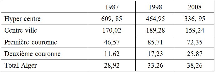 Les densités de peuplement ont connu également des évolutions significatives très nettes. Les données des recensements montrent bien un accroissement général de la densité de population, passant de 28,92 hab/ha en 1987 à 38,26 hab/ha en 2008. Cette évolution générale cache cependant deux mouvements contraires : une baisse très forte des densités dans l’hyper centre et un peu moins accentuée dans le centre-ville ; un doublement de la densité pour la première couronne entre 1987 et 1998, suivie d’un repli entre 1998 et 2008, et enfin une hausse continue des densités dans la deuxième couronne. Les quartiers centraux connaissent ainsi un délestage très net de leurs populations vers les zones périphériques, selon le même mode constaté pour les taux de croissance démographique. Cette baisse très forte des densités s’observe en ce qui concerne les quatre communes composant l’hyper entre algérois dans les deux communes de Bab El Oued et de la Casbah qui sont passées respectivement de 852 à 529 et de 606 à 334 habitants à l’hectare entre 1987 et 2008. C’est donc une remarquable décompression démographique qui s’est réalisée en l’espace de vingt années, qui n’est pas attribuable uniquement aux effets des opérations de relogement des familles sinistrées victimes des inondations de 2001 et du séisme de 2003 et à la délocalisation des familles touchées par la rénovation de certains îlots d’habitat de la Casbah, qui n’ont concerné dans l’ensemble que près de 5000 familles, soit près de 32 000 habitants. Les raisons de ce phénomène procèderaient d’une logique de sortie volontaire de ces quartiers pour des raisons plus complexes que nous verrons plus loin.