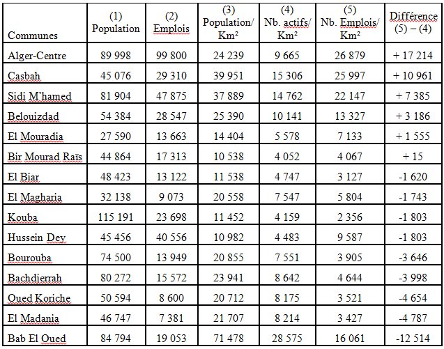 Le tableau 4 réalisé à partir de la compilation de données sur l’emploi pour l’année 2004 établit un taux de croissance de 5% des emplois entre 2002 et 2004 pour l’ensemble de l’agglomération. Il permet de saisir les contrastes très forts entre communes à l’intérieur du périmètre urbain central (hyper centre et centre ville) en terme de concentration des emplois. Il montre un excédent de près de 40 000 emplois par rapport au nombre d’actifs par km² dans les cinq communes centrales d’Alger-centre, de Belouizdad, de la Casbah, Sidi M’hamed et El Mouradia, qui s’oppose au déficit en emplois par rapport aux actifs dans les neuf autres communes du centre ville qui appartiennent à la “ceinture ouvrière” historique d’Alger dans ses deux composantes Ouest (les communes de Bab El Oued et de Oued Koriche et la partie de la commune d’El Biar qui la jouxte) et Est (les communes de Bach Djarrah, Bourouba, Hussein Dey, El Magharia et Kouba), sans oublier l’enclave d’habitat “populaire” d’El Madania (ex Clos Salembier).