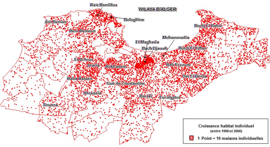 Le redéploiement des populations algéroises en périphérie s’est réalisé selon des modalités assez complexes que nous ne pouvons développer dans le détail dans le cadre de cet article. Quelques cartes thématiques confectionnées à partir d’indicateurs significatifs et pertinents et quelques chiffres et ordres de grandeurs permettent de dégager les tendances et mouvements principaux. Il y a lieu tout d’abord de faire une distinction première en fonction du type d’habitat : habitat individuel versus habitat en immeuble collectif qui procèdent de mécanismes d’accès différents d’une part et de regarder ensuite de plus près  à l’intérieur de chacune de ces catégories les logiques de différenciation plus subtiles.