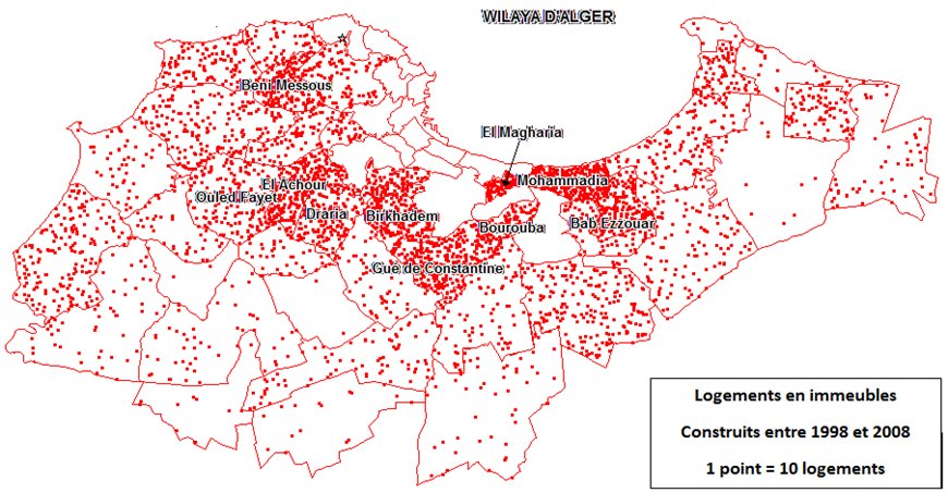 En tout état de cause, il est tout à fait clair que les 24 300 baraques qui ont été construites entre 1998 et 2008 – qui ont fait passer la proportion d’habitat précaire par rapport à l’ensemble du parc d’un chiffre de 5,9% en 1998 à 9,1% en 2008, ce qui est un taux considérable – ont procédé dans leur majorité d’une logique d’installation plus endogène que les logiques ayant fonctionné avant 1987. Ce qui indique, sinon un dérèglement dans les procédures de contrôle de l’urbanisation au niveau de la wilaya d’Alger, du moins un problème réel d’offre résidentielle pour les jeunes ménages algérois provenant des quartiers populaires, dont la seule perspective résidentielle reste la construction de baraques dans les tissus interstitiels des anciens quartiers ou leur érection dans les communes où s’est exercée la moins forte pression administrative.