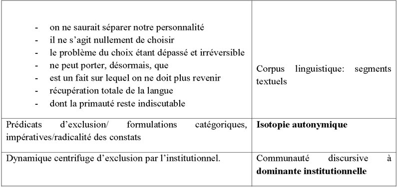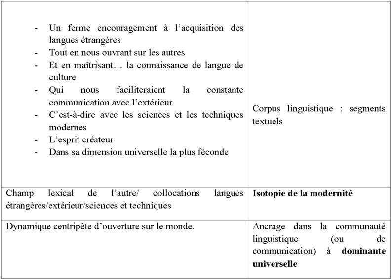 En effet, le regroupement des segments textuels qui le composent  révèle une cooccurrence d’isotopies sémantiques reconstruites à partir de champs lexicaux producteurs des sens discursifs sous-jacents et qui distinguent bien les fonctions et rapports que la langue doit entretenir dans ces trois dualités : catégorie isotopique identitaire / communauté à dominante idéologique ; catégorie isotopique autonymique / communauté à dominante institutionnelle ; et catégorie isotopique de la modernité / communauté à dominante universelle, comme illustré dans le tableau suivant : ci-dessous les trois champs isotopiques.