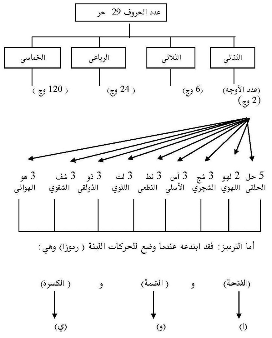 3ـ ( الإحصاء) و(الكم) : نعلم جيدا أن الخليل ( أحصى) كلام العرب على أساس حروف الهجاء التسعة والعشرين ؛ فوجدها ـ أي لغة العرب ـ ثنائية أو رباعية أو خماسية أما (التكميم الرياضي) نجده في قوله :"اعلم أن الكلمة الثنائية المضاعفة تتصرف على وجهين، نحو قدّ ودقّ، وشدّ ودشّ، والكلمة الثلاثية تتصرف على ستة أوجه تسمى مسدوسة، وهي نحو : ضرب، رضب، ربض، ضبر، برض، والكلمة الرباعية تتصرف على أربعة وعشرين وجها، وذلك أن حروفها وهي أربعة أحرف ضربت في وجوه الثلاثي الصحيح، وهي ستة ؛ فصارت أربعة وعشرين وجها، يكتب مستعملها ويلغي مهملها (…) والكلمة الخماسية تتصرف على مئة وعشرين وجها وذلك أن حروفها وهي خمسة أحرف، ضربت في وجوه الرباعي وهي أربعة وعشرون وجها ؛ فصارت مئة وعشرين وجها، يستعمل أقله ويلغي أكثره"[29].