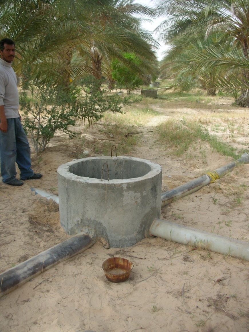 Le gaspillage de l’eau d’irrigation provenant des nappes fossiles et les rejets des eaux de drainage ont crée une situation d’hydromorphie dangereuse. A l’intérieur même de l’oasis, l’hydromorphie touche, selon les services techniques de l’Office, environ 50 ha. Il faut noter que ces problèmes d’hydromorphie se retrouvent aussi dans beaucoup d’oasis algériennes du Bas-Sahara, en raison d’une topographie similaire[12]. Cette situation est paradoxale dans un environnement désertique.
