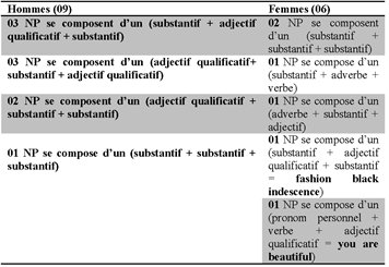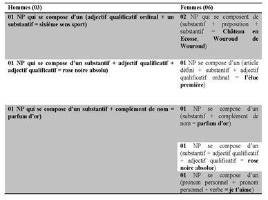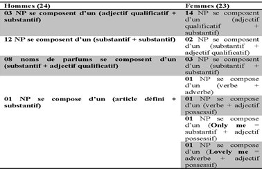 Nous remarquons que sur les 53 NP composés de deux mots, 47 sont entièrement en anglais. Pour les NP masculins, il n’y a que 04 variantes de structures morphologiques alors que pour les NP féminins, il y en a 07. La variante récurrente dans les NP masculins est la suivante : substantif + substantif avec 12 occurrences. Tandis que dans les NP féminins, c’est la structure (adjectif qualificatif + substantif) qui est la plus récurrente avec 14 occurrences.