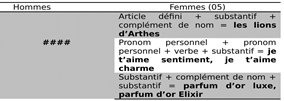 Pour les 08 occurrences de NP masculins, la structure (substantif + adjectif qualificatif) est agrammaticale vu qu’en anglais, c’est l’adjectif qualificatif qui précède le substantif et non l’inverse comme nous pouvons le constater au travers des NP de luxe comme, par exemple, « black orchid » de Tom Ford ou dans « Fairplay » de Cerruti.