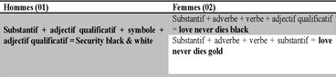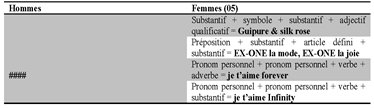 Aucun NP masculin ne fait référence à aucune déclaration. Toutefois, 12 NP féminins renvoient à des déclarations différentes en français, en anglais et en italien (Je t’aime forever, you are beautiful, amore mio, amore mio forever, amor mio I love you, love me, kiss me, je t’aime sentiment, je t’aime blanc rayé, je t’aime charme, je t’aime mauve plein, je t’aime infinity). Nous remarquons que ces déclarations sont faites en français, en anglais et en italien, mais pas en arabe. De plus, certains NP féminins comme je t’aime sentiment, je t’aime blanc rayé, je t’aime charme, je t’aime mauve plein, je t’aime infinity sont asémantiques.