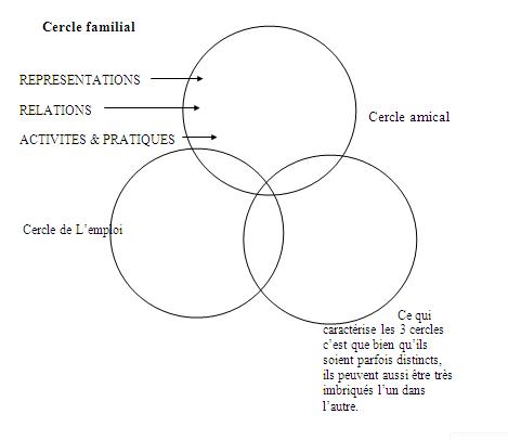 Ces trois cercles, imbriqués l’un dans l’autre, représentent le réseau social de fréquentation de nos unités d’investigations. Chacun d’entre eux sera donc étudié au niveau de trois des principales pratiques sociales: les représentations, les relations, et les activités et ce, afin que chaque cercle puisse répondre aux trois hypothèses posées au départ.