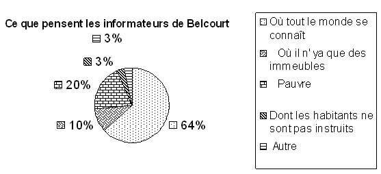 Suite à une série de questions visant à savoir comment le quartier de Belcourt est perçu par nos informateurs, nous sommes arrivés à la conclusion suivante : Le quartier de Belcourt jouit d’une réputation de quartier « populaire » auprès des informateurs de Belcourt et de Hydra qui s’accordent, presque à l’unanimité, sur cette dénomination (88% à Belcourt et 97% à Hydra).