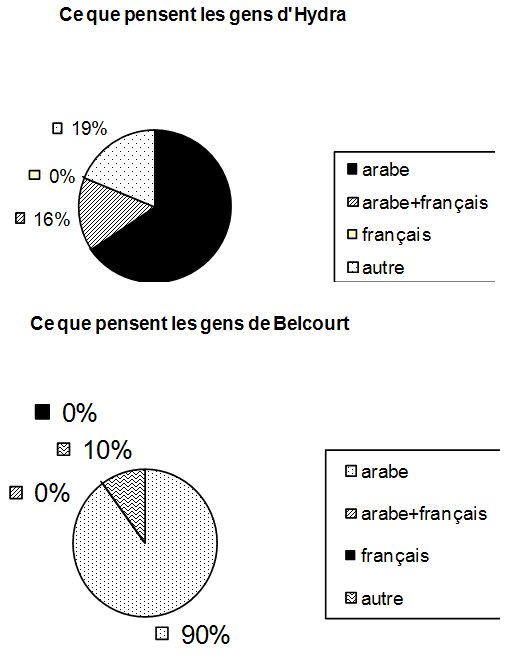 Même si un certain nombre d’informateurs de Hydra (16%) disent que les habitants de Belcourt alternent entre la langue arabe et la langue française, et que (19%) évoquent tantôt l’usage des Belcourtois des trois langues (arabe, tamazight, français), tantôt leur pratique de l’arabe et du tamazight seulement, une majorité d’enquêtés interrogés à Hydra (65%) pense que la langue arabe est la plus pratiquée à Belcourt. Citons par exemple, E.H.1qui croit que les langues que les Algérois pratiquent dépendent des quartiers où ils habitent « A Belcourt, ou à El  Harrach, je ne pense pas que, qu’ils utilisent le français ». Si cette informatrice dit que la langue française n’est pas parlée à Belcourt, elle pense forcément que l’usage de l’arabe algérien ou du berbère est le plus fréquent dans ce quartier.