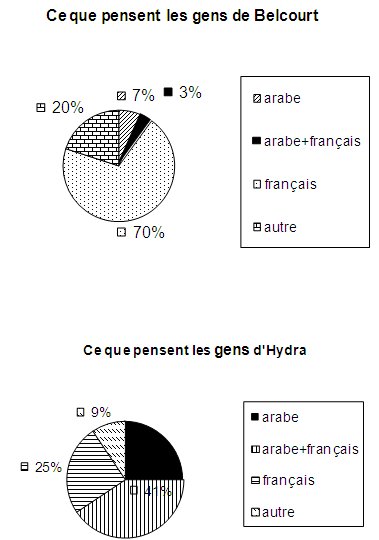 Un deuxième groupe minoritaire qui dissocie ses représentations spatiales de ses représentations linguistiques. Ce groupe pense que la pratique de la langue française n’est pas spécifique aux habitants de Hydra, mais aussi que les habitants de Belcourt ne s’expriment pas qu’en langue arabe.