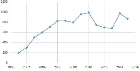 Graphique 3 : Nombre de mineurs de mineurs de 14-17 ans condamnés (2005-2016)