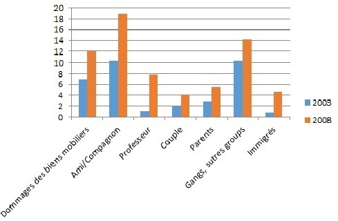 En outre, il est nécessaire d'inclure les réponses sur une période où la population est plus consciente des divers types de violence qui l'entourent. 81,6% des personnes interrogées estimaient que notre société était très ou assez violente. Ce pourcentage était passé à 87,7% en 2008. Les données sont plus significatives si nous comparons les pourcentages de la population qui considère qu’en Espagne il y avait très peu ou il n’y avait pas de violence, 16,6% en 2003, pourcentage qui diminuait jusqu’à 11,9% en 2008. Ces données indiquent comment l’idée que notre société est plus violente commence à s’établir entre la population