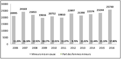 Figure 1 : Le nombre des mineurs déférés aux tribunaux du royaume avec la part des filles en % (2006-2016)
