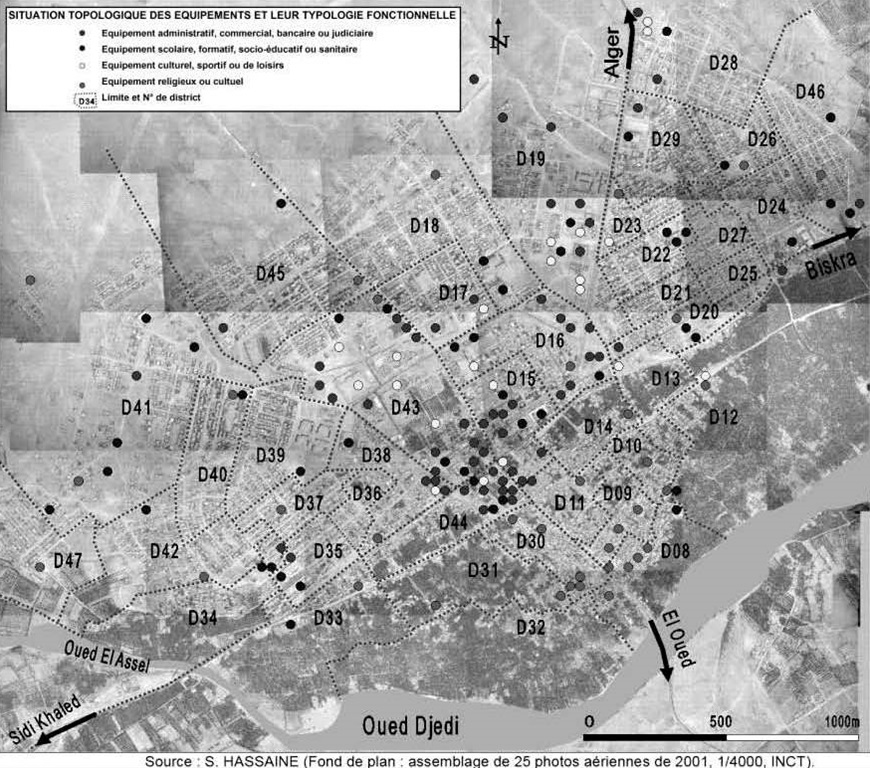 Les données utilisées dans ce travail relèvent d’une enquête de terrain qu’on a effectuée en 2009. A travers les 40 districts formant la ville, on a localisé spatialement tous les équipements et les commerces sur le plan quantitatif et qualitatif. Pour la cartographie, on a travaillé sur des photos-contact de l’INCT, d’échelle 1/4000. Cependant, pour avoir une vision globale permettant de comparer entre l’importance fonctionnelle des districts, on a utilisé une seule carte réalisée par assemblage de 25 photos aériennes faisant couvrir toute la ville. Quant aux données démographiques, on a utilisé celles du RGPH de 1998 et 2008.