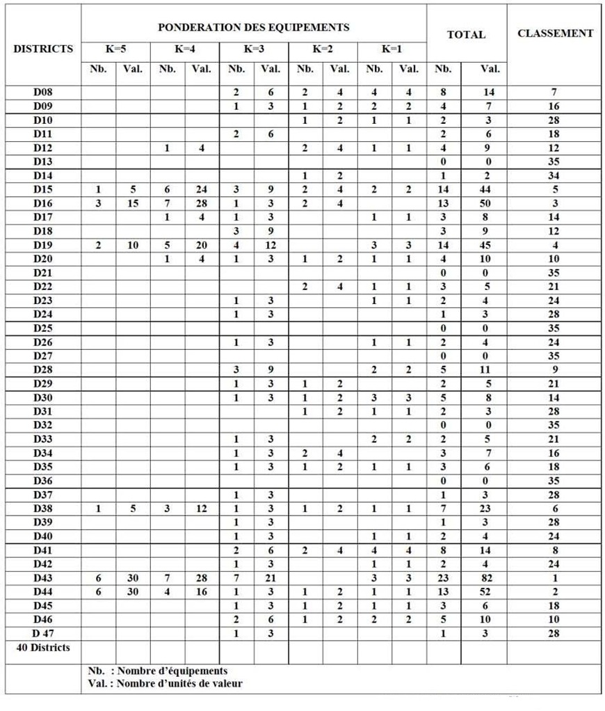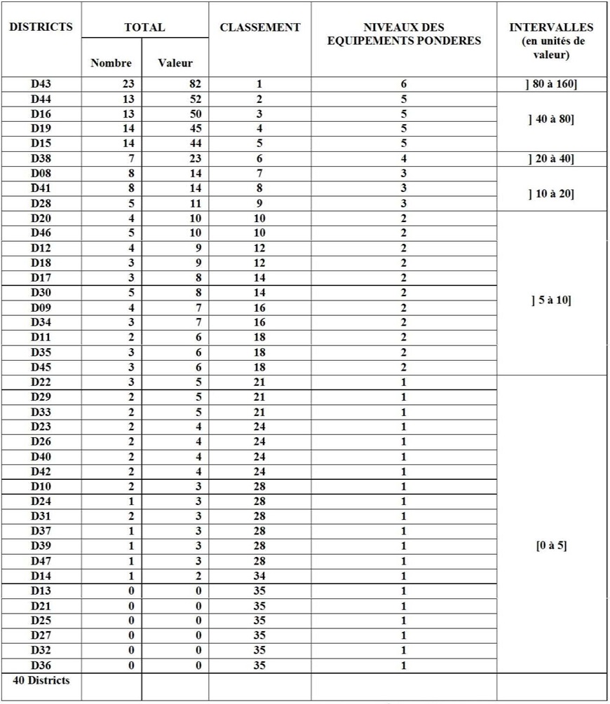 La répartition des équipements sur l’ensemble des districts et leur hiérarchisation permettent de mettre en exergue leurs niveaux partiels définis selon la logique de progression géométrique et leurs niveaux synthétiques selon la logique de progression arithmétique.