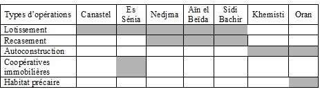 Le lotissement semble l’opération la plus couramment utilisée avec plus du 1/3 de l’ensemble des constructions recensées. Dans les nouveaux espaces urbanisés d’Oran, les types d’opération de l’habitat produit sont certes diversifiés, mais ils diffèrent d’un site à un autre (tab. 2). Les lotissements et les recasements dominent à Aïn-el-Beïda, à Sidi-Bachir et à Nedjma, tandis que l’autoconstruction n’est présente que sur les sites de la commune d’Oran (Cheikh-Bouamama, dit El-Hassi) et Bir-el-Djir (Khemisti). Quant aux coopératives immobilières enquêtées, elles ne sont présentes que dans la commune d’Es-Sénia. L’habitat précaire enquêté est implanté principalement dans la commune d’Oran, à Bouakeul et Cheikh-Bouamama (dit El-Hassi).