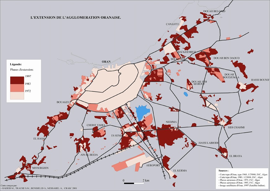 Au sein de l’aire métropolitaine d’Oran, l’extension rapide de fragments habités planifiés et non planifiés, implantés sur des terres publiques, a produit au cours d’un quart de siècle (1974-2002) une différenciation physique d’abord, morphologique ensuite. Le desserrement géographique et démographique en direction des territoires périphériques est somme toute classique, mais il reste caractéristique de l’urbanisation d’un pays du tiers-monde en raison de la non-maîtrise foncière, de la place occupée par l’habitat spontané et de l’absence du respect des plans d’urbanisme approuvés. Certes, l’Etat, acteur principal, avec sa réglementation juridique, ses normes de construction, ses institutions locales, ses instruments, ses moyens matériels…, a fini par être dépassé, à partir du moment où il a délégué l’application de sa politique foncière à des groupes sociaux situés dans le pouvoir local ou à ses marges ; encore une fois, l’allocation foncière irréfléchie faite par les assemblées communales successives, les irrégularités foncières et la déficience du contrôle ont fini par modeler un espace habité éclaté et inachevé, marqué par une série de ruptures du paysage urbain.