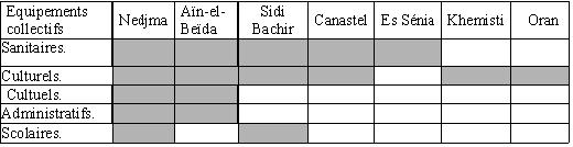 [2]  - Huit lieux à travers 16 lieux habités ont été soumis au sondage : Canastel, Khemisti, Nedjma (recasement, lotissement), Es-Sénia (Bahi Amar, Si Redouane, Kora I et II, Habitat collectif récent), Aïn-el-Beïda (40 logements, lotissements, programme C.N.L., Cité O.PG.I.), Bouakeul (Douar A, Douar B), El-Hassi.
