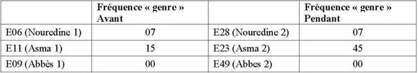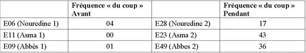 Il est intéressant de constater, à la lecture des trois tableaux, que nos informateurs n’emploient pas les trois mots avec la même fréquence. Les chiffres concernant l’usage de « du coup » par Asma et Abbas, de même que « genre » chez Asma, sont significatifs d’une dynamique langagière.