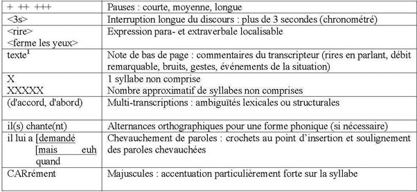 Les entretiens semi-directifs réalisés, d’une durée d’une heure en moyenne, ont été transcrits. La convention par défaut pour la notation est l’orthographe standard du français. Le choix d’une transcription orthographique répond aux exigences de lisibilité et de fidélité à la fois. Elle permet une navigation commode dans les transcriptions (pour la recherche de mots clés, par exemple). Les conventions de base utilisées sont présentées en annexe.