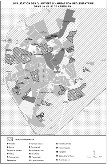 Manifestement, la ville de Kairouan a connu une urbanisation non-réglementaire soutenue au cours des deux dernières décennies. Les pouvoirs publics ont toléré cette urbanisation en suivant une stratégie de laisser-faire. En effet, l’État s’est attaché, après la crise de 1978, à éviter les affrontements directs avec les habitants des quartiers d’habitat non-réglementaire. Pour ce faire, il a essayé d’absorber les tensions sociales découlant par exemple de la pénurie des services urbains en amplifiant les structures et les instruments de contrôle et de régulation politique à l’échelle locale. Il s’est agi pour lui, d’une part, de mettre à jour le découpage administratif en tenant compte de l’accélération de l’urbanisation et de l’émergence des nouveaux quartiers «irréguliers», et, d’autre part, d’exécuter et de médiatiser un certain nombre de projets de réhabilitation urbaine. La mise en œuvre de ces projets a valorisé, à la fois, ces actions en tant qu’instruments de légitimité à l’échelle de ces quartiers, et le rôle des acteurs locaux en tant que protagonistes de la gouvernance locale.