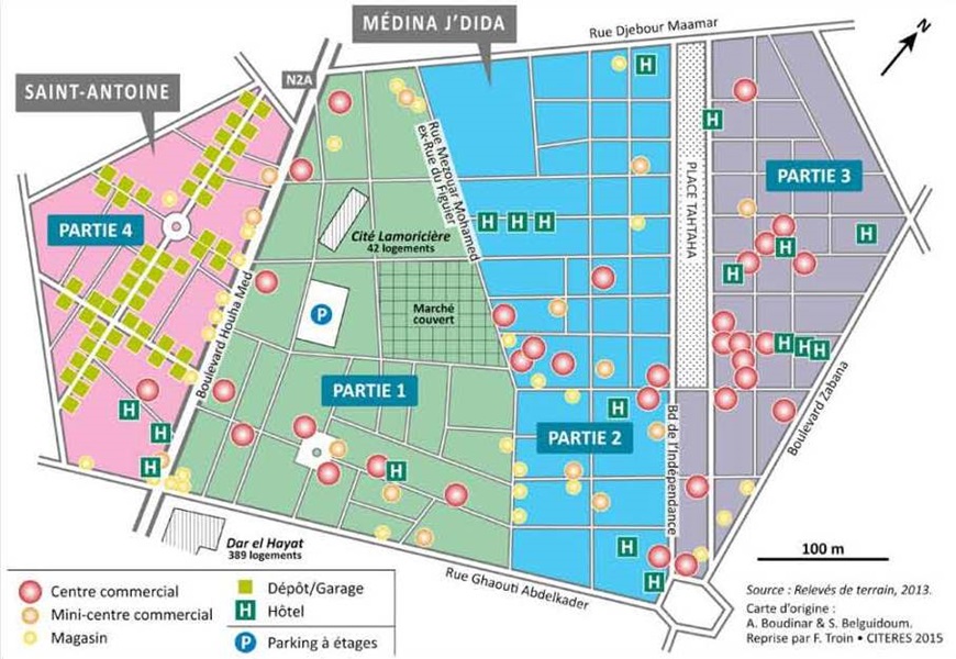 فالمدينة الجديدة و"شوبو" والعقيد لطفي وكاسطور، هي من الأحياء المجاورة لوسط المدينة والتي أصبحت، منذ بداية الألفية الثانية فضاءات رمزية للتجارة العابرة للوطن. وعليه فإن التقسيم المختلف للساحات التجارية في المدينة أدى إلى زعزعة التنظيمات الهرمية المتواجدة سلفا، وقد حلّ محل التمركز المفرط للأنشطة التجارية في وسط المدينة توزيعا جديدا تتأكد من خلاله أقاليم حضرية جديدة.