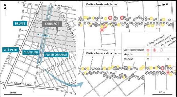 وإذا كان هذا النمط من التجارة قد امتد للوهلة الأولى ليشمل الضواحي الحضرية، فإنه ومنذ عشرية من الزمن أصبح يحتل مكانة هامّة في المدن من خلال تملّكه لأحياء استعمارية قديمة ولأنسجة مجاورة لمراكز المدن. هذا التوجه والذي كان ملموسا في مدن مثل مدينة سطيف2 أو قسنطينة، يشهد عليه التحوّل الذي عرفه الحي السكني لسيدي مبروك [3]وهو ما يظهر أيضا بقوة في مدينة وهران.