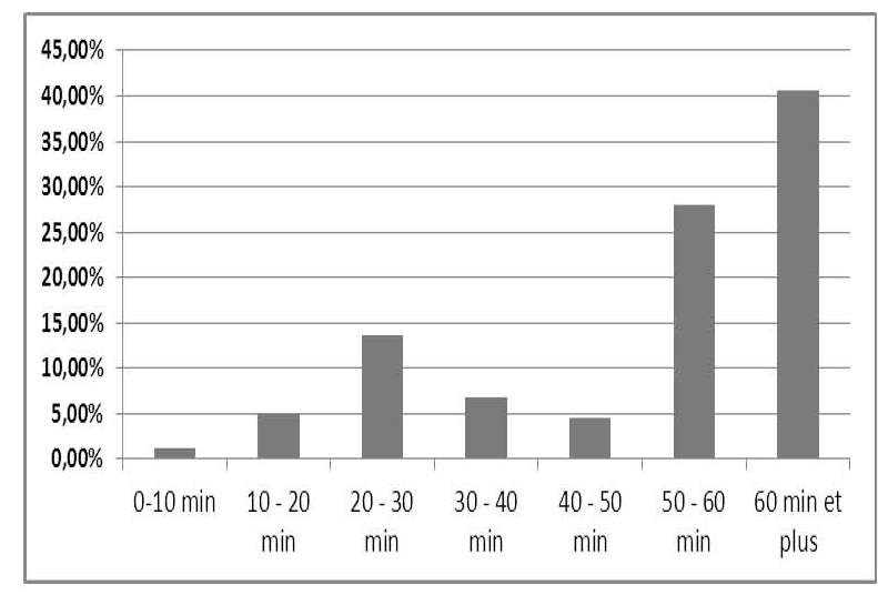 Dans le même ordre d’idées, et pour évaluer d’une maniéré plus pertinente la pénibilité des conditions de déplacement des usagers du réseau de transport collectif, l’enquête effectuée a mis en évidence quelques défaillances du système de transport actuel, dans la mesure où les ruptures de charges sont importantes et les distances parcourues pour rejoindre le premier point de rabattement des TC sont assez importantes. En effet 40,57% des personnes enquêtés ont une durée de déplacement qui dépasse les 60 min et 28% consomment une durée de déplacement entre 50 – 60 min. Cette situation pénalise fortement les usagers des transports collectifs et favorise dans le même temps l’augmentation des taux de motorisation des ménages. Seul le réseau TCSP constitue le mode capable d’apporter une valeur ajoutée à la qualité de service des réseaux de transport collectif.
