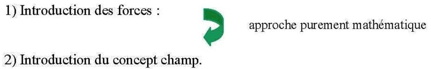 La démarche adoptée pour introduire le champ (de gravitation ou électrique) fait appel, en premier lieu, à un autre concept, le concept de force, qui existerait entre deux masses m1 et m2 ou deux charges q1 et q2. Le phénomène d’attraction (ou répulsion) n’est que sous-jacent dans la démarche. L’étape suivante consiste à représenter les forces mathématiquement par des expressions, soit :