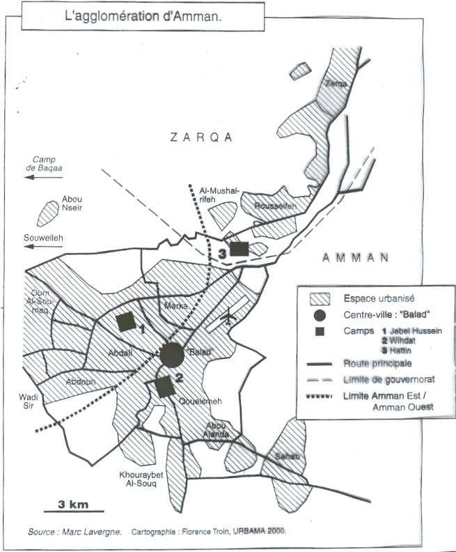 Au total, Amman apparaît comme une capitale profondément divisée de l'intérieur, en deux parties relativement homogènes qui se tournent le dos, à la fois spatialement et socialement. C'est également, de par la volonté de l'Etat, une capitale, Amman, qui refuse de faire place au sein d'une communauté urbaine à l'ensemble de la conurbation qu'elle forme, nolens volens, avec Zarqa et Rousseifeh.