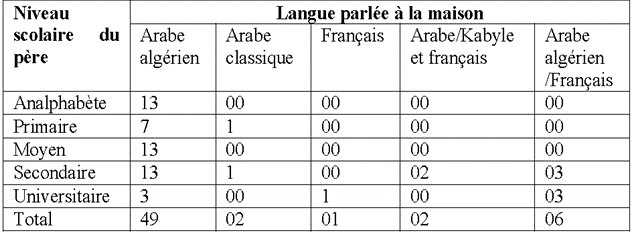 Nous ne pouvons évoquer le niveau scolaire de la mère et son impact sur la langue parlée à la maison sans que nous n’abordions celui du père qui, à son tour, possède un rôle aussi important. Le tableau ci-dessus montre les mêmes résultats que nous avons pu relever concernant la mère.