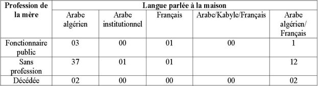 La profession de la mère semble aussi un facteur important ayant un impact sur l’utilisation d’une langue par rapport à une autre. Cependant, cela reste limité dans le cadre de notre recherche car, comme nous l’avons souligné plus haut, notre enquête s’est déroulée dans un milieu semi-urbain voire même rural. Par conséquent, les mères qui composent l’échantillon, sont soit sans profession, soit elles exercent dans le secteur public. Dans d’autres cas, les sujets apprenants sont orphelins de mère.