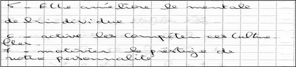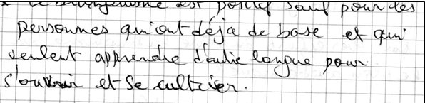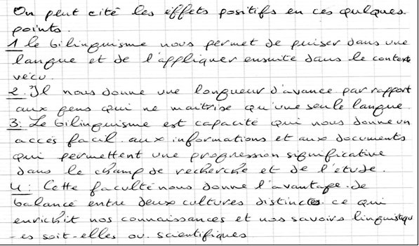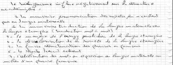 L’écrit de l’étudiant témoigne d’une compartimentation des apprentissages ne permettant guère une corrélation en faveur d’une compétence communicative bilingue élaborée.