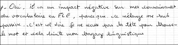 Réponse 3 : (cf. enregistrement 7) : cela revient négativement parce que/ euh/euh/ comment est-ce dit le/ euh/ euh/ …/ parce que j’arrive pas à maitriser le français parfaitement