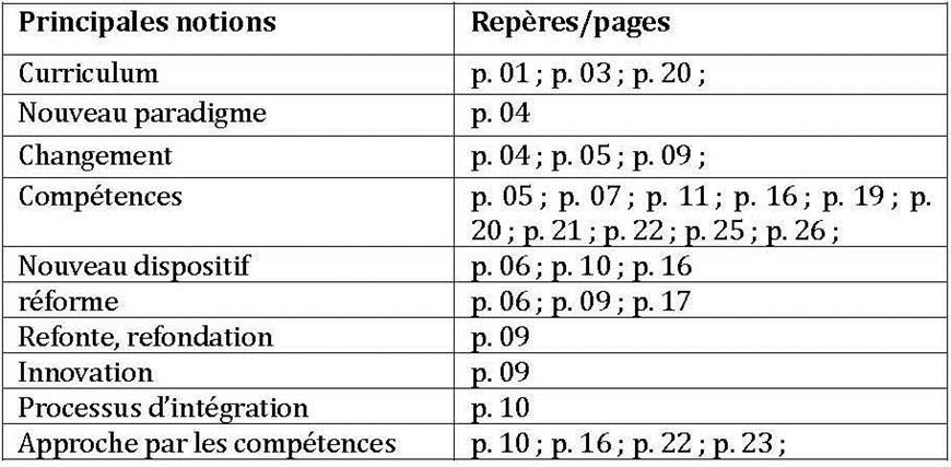 Pour appréhender les principaux fondements de cette réforme, telle qu’elle est décrite par ses auteurs-concepteurs (en 2005 et 2006) et par le référentiel général des programmes (2009), nous avons procédé à un relevé systématique des principales notions sur lesquelles un accent particulier semble avoir été mis.