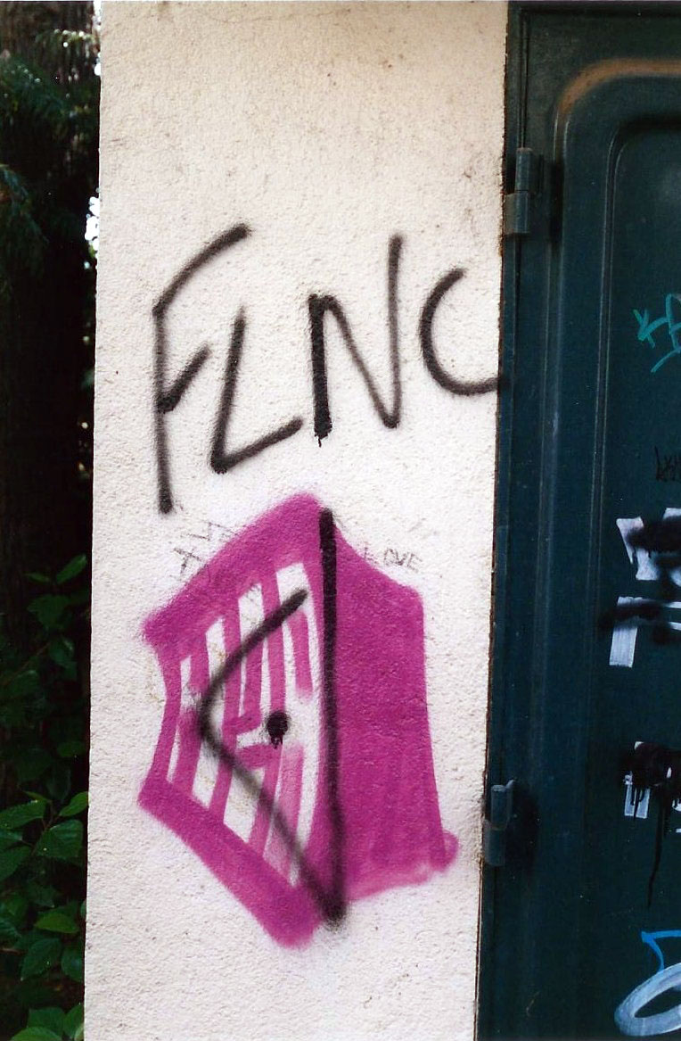 Ainsi, le « FLNC » est un message peint depuis quatre décennies sur des centaines de kilomètres de routes. Autour de ce sigle, d’autres mots d’ordre peints sont des emprunts au vocabulaire de la guerre d’Algérie. Leur traduction en langue corse est l’adaptation locale du modèle importé : « sculunisazione, autodeterminazione, indipendenza ». Ces mots clés apparaissent aussi dans le sigle d’organisations. Le « A » du parti le MPA était par exemple « autodétermination ». La Guerre d’Algérie se retrouve également dans l’usage de termes liés à cette période. Les « Pedi neri fora » visaient les rapatriés. Afin de stigmatiser le préfet Riolacci, nommé en Corse au moment des évènements de la cave d’Aleria en 1975, des graffiti « Riol’harki » furent bombés. Les dessins de la valise ou le cercueil furent et sont toujours bombés accompagné du « IFF ». Dans les années 1970, la Légion étrangère, partie d’Algérie s’était installée sur plusieurs sites insulaires. La campagne « Legione fora » fit poser des graffiti sur l’ensemble de l’île. Contre l’armée, les indépendantistes se pensent en guerre. Celle-ci n’est pas officielle. Qu’importe, puisqu’en Algérie, elle ne l’était pas non plus. Aussi, déclarent-ils des « trêves ». Et certains militants parfois impatients bombent  dans les années 1980 « À treva basta ». Un militant nationaliste me dit avoir vu dans les années 1990 un difficilement interprétable « La seule négociation, c’est la guerre (F. Mitterrand) » prononcé quand son auteur était ministre de l’Intérieur chargé des « évènements d’Algérie ». En 1980 eut lieu « l’affaire Bastelica Fesch ». Il fut prouvé qu’une version corse du SAC opérait dans l’île. Cela donna lieu à une campagne de graffiti « Barbouzes fora ». Ce terme réapparu sur les murs en 1999 au moment de « l’Affaire des paillottes ». Quand en 1983 disparait Guy Orsoni, le graffiti qui est alors bombé par les nationalistes est le pendant des « De Gaulle assassin » de l’OAS : « Statu francese assassinu ». Le dessin du clandestin, relativement rare correspond principalement à des formes stéréotypées. Chacune montre un militant dont on ne voit de la figure, dissimulée par une cagoule, que les yeux.  On peut remarquer qu’une des fonctions du ribellu, est identique à celle des deux yeux peints par l’OAS. Le message qui veut être diffusé partout est « le FLN corse veille ».