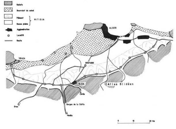 Bel et bien antique, le terme « douar » se généralise encore davantage durant la période post-indépendance pour désigner sans distinction les entassements campagnards de nombre de régions du pays. C’est de cette manière que les toutes récentes concentrations de la plaine de la Mitidja, à l’exemple de bien d’autres aires rurales, se trouvent de nos jours dénommées par leur propres habitants « douar », devenu ainsi un vocable standard. [5] Or, si l’on reste au seul exemple de l’espace mitidjien, (voir carte) on conçoit aisément que la formation de cette zone doit autant aux caractéristiques géographiques de l’ensemble de la région qu’à l’histoire qui a contribué peu à peu à la façonner.