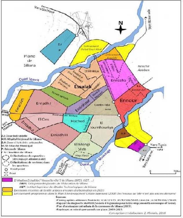 Siliana, une petite ville du Nord-Ouest de la Tunisie, a subi une multitude de transformations depuis l’indépendance de la Tunisie (il y a 60 ans), à savoir l’augmentation rapide de sa population[2], l’arrivée assez massive de nouvelles populations relativement diversifiées (des ruraux, en majorité, portés par l’exode rural) mais aussi des fonctionnaires et des citadins mutés à la ville à partir du moment où elle fut promue chef-lieu d’un nouveau gouvernorat en 1974[3]. L’étalement urbain et l’apparition de nombreux nouveaux quartiers de différents types a constitué une périphérie urbaine diversifiée mais à dominante populaire. Il est donc question de s’interroger sur la manière dont ces quartiers populaires périphériques sont appréhendés par leurs populations : Quelles représentations ces dernières s’en forgent ? Quels symboles et quelles valeurs elles leur attachent?