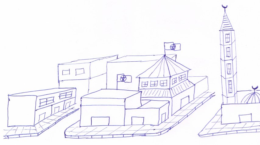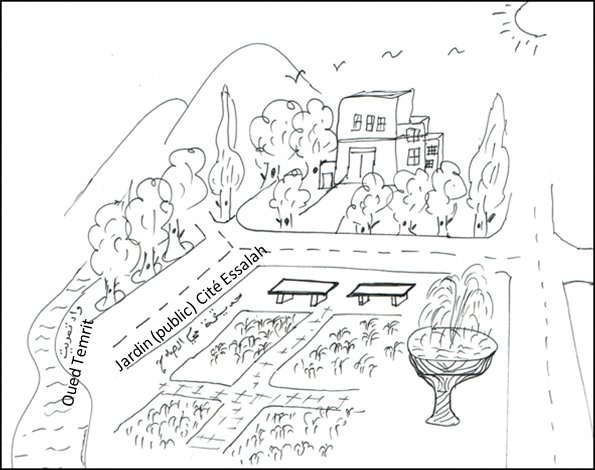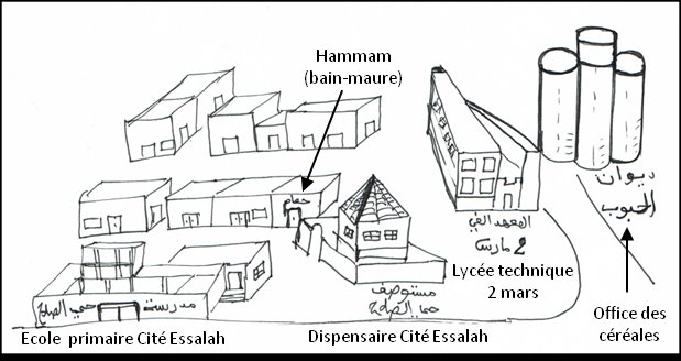 Or, comprendre un espace de vie, un territoire donné, exige de re-construire la (les) représentation(s) mentale(s) de la situation décrite par ceux qui habitent ou qui y usent. Ainsi, de point de vue méthodologique, et pour dégager et interpréter les représentations du quartier par sa population (résidents et non-résidents), nous nous sommes appuyés sur des entretiens semi-directifs et un exercice de production graphique en adoptant, pour l’analyse, celles que nous estimons plus riches de représentations. Les dessins relatifs aux représentations de l’espace se révèlent parfois être un outil extrêmement riche, et nous les avons utilisés avec précaution en vue de détaler le risque de surinterprétation[4]. Ainsi, partant du propos de Denis Jodelet[5], selon lequel « les représentations sont des modèles intériorisés que le sujet construit de son environnement et de ses actions sur l'environnement », nous avons demandé à nos interviewés de dessiner au moins trois images représentatives de leur quartier (Essalah) et d’en élire, par la suite, une qui représente (parle) le plus ce quartier. Le fait de dessiner trois images représentatives (ou plus, selon la volonté de l’interviewé), donne au dessinateur la possibilité de stimuler son activité imaginaire en essayant d’inscrire le maximum possible d’informations dans ses images mentales. Alors que le fait d’en choisir et d’en retenir qu’une seule image mentale, permet, selon nous, de découvrir la représentation synthétique du quartier résultant de l’activation, sous l’impulsion d’un stimulus, d’un ou de plusieurs éléments d’information multi-sensoriels préalablement stockés en mémoire à long terme. Ce qui participe à une meilleure compréhension de l’imagerie mentale de chaque individu en train d’imaginer son quartier. Cette imagerie mentale est, en effet, « une forme singulière de représentation mentale permettant à l’esprit humain de conserver et de manipuler l’information extraite de son environnement, [mais aussi] une modalité de la représentation mentale qui a pour caractéristique de conserver l’information perceptive sous une forme qui possède un degré élevé de similitude structurale avec la perception » (Denis, 1989).