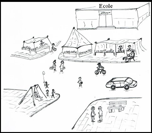 À l’inverse, les représentations mentales des membres de l’ADSN mentionnent plus rarement la présence d’espaces verts ou bleus et témoignent d’une utilisation différente du milieu de vie, qui semble s’exprimer davantage en termes de services (dessin n° 3).