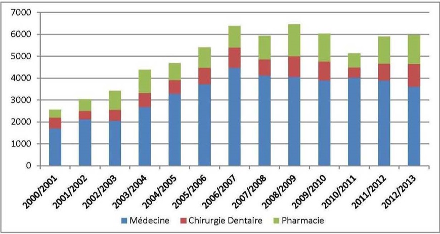 Il convient toutefois de signaler qu’en dépit des conditions très sélectives d’accès aux études de médecine, le tableau n° 03 nous renseigne sur la tendance ascendante des effectifs des étudiants en médecine, pharmacie et chirurgie dentaire, mais elle reste relativement importante au regard des ratios de couverture en médecins et pharmaciens déjà satisfaisants.