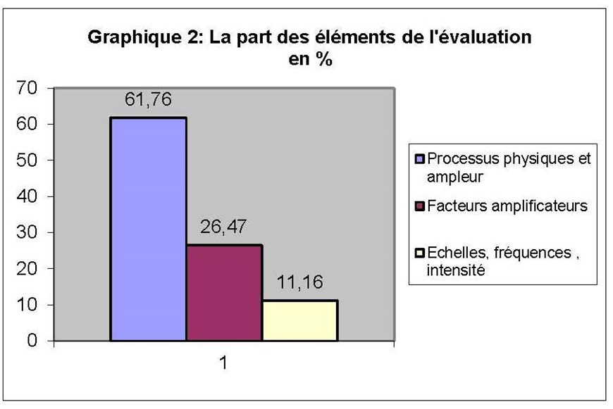 -Le contenu s’intéresse surtout à l’étude des processus physiques de déclenchement des événements : en effet, les auteurs ont tendance à décrire avec précision les origines, les mécanismes et les manifestations des phénomènes catastrophiques. Aussi, privilégient-ils la mise en relief de l’ampleur (effets) de ces phénomènes. D’autre part, l’examen de la part de contenu consacrée à l’étude des processus physiques et de l’ampleur des phénomènes montre que 61.76% de ce contenu concernent les processus physiques et l’ampleur, 26.47% concernent la vulnérabilité ou les facteurs amplificateurs, 11.76% seulement se rapportent aux autres éléments de l’évaluation c’est-à-dire la fréquence et l’intensité des phénomènes étudiés. Autrement dit, la fréquence et l’intensité sont rarement évoquées comme le montre le graphique 2. Les auteurs ont tendance à donner la primauté à l’action de la nature puisque l’action des groupes sociaux ne commence réellement qu’avec la gestion des risques : le contenu des leçons à propos des risques naturels apparaît comme un contenu à dominante plutôt physique.